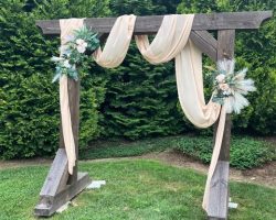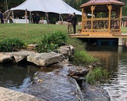 1. Cathedral in the Woods (or we call it “Stump Henge”) consists of a beautiful copper-topped timber framed arch in the woods across the stream from the pond. Stumps are lined up in a circle for sitting or we have 25 white plastic chairs and wooden benches you can arrange. We’ve had weddings of 10 people to 200 people standing and sitting in a cozy embrace of support for the wedded couple. Great ceremonial area. Cool in the summer shade. Electrical outlet. Parking close by. Walk to Peterson Pond for the reception.