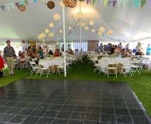 Go through the arched entrance to the flat, grassy area where you have several choices of where to put a tent. A 40×40-foot looks nice, so does a 40’x 60’ to hold 100 people seated at round tables plus serving area. Tents, chairs, tables, dance floors, sound equipment and staging can be rented through our recommended vendors – just talk to Janet.